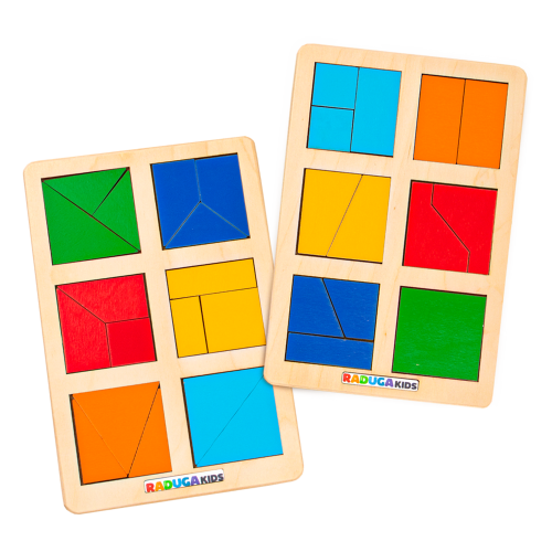 Задача малыша - собрать целый квадрат из одноцветных фрагментов различной формы, начиная с самых простых.