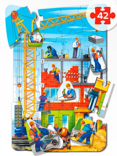 Рамки вкладыши с деталями человечками разных профессий. Вкладыш подсказка-инструкция. Крупный макси пазл из 42 деталей выполнен из плотного жесткого картона с ламинацией, не деформируется. Фигурный пазл удобен для детских рук и легко собирается. Размер собранного поля 45х28см. Прочная подарочная коробка размером 18х18х4,5 см.