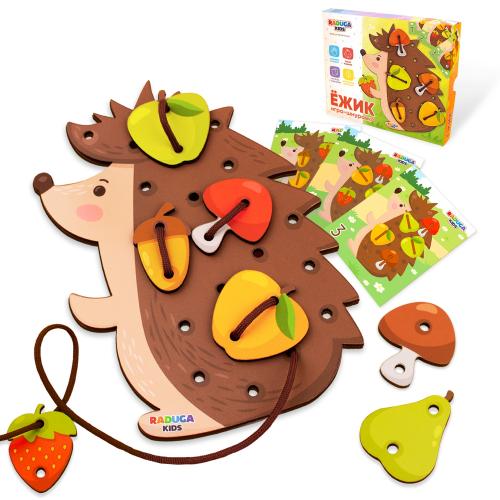 Красочная шнуровка ежик на полянке, увлекательная игра для малышей. Игра выполнена в форме веселого ежика, подарит малышу массу положительных эмоций и позволит непоседе от 2-3-х лет развить мелкую моторику, внимание, логическое мышление, координацию движения рук, укрепить мускулатуру пальчиков. Придумайте интересную историю про ежика, чтобы учиться шнуровать стало ещё интереснее. Ребенку предстоит при помощи шнурочка пришить к большому веселому ежику 6 элементов: яблоко, грибок, желудь, грушу и клубнику.